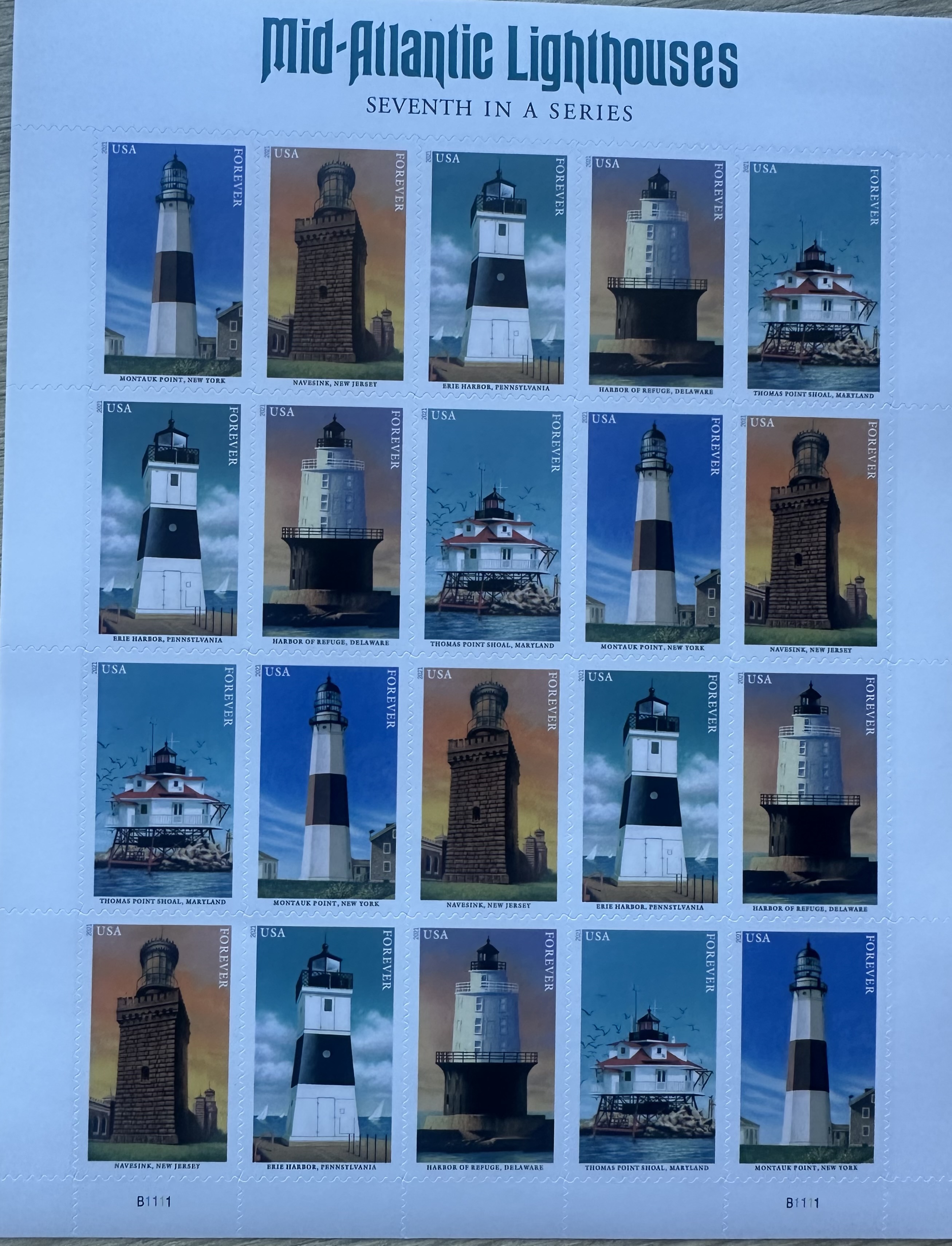 Mid Atlantic Lighthouses- Sleeve of USPS Forever stamps. Self adhesive- Use them, collect them, frame them.