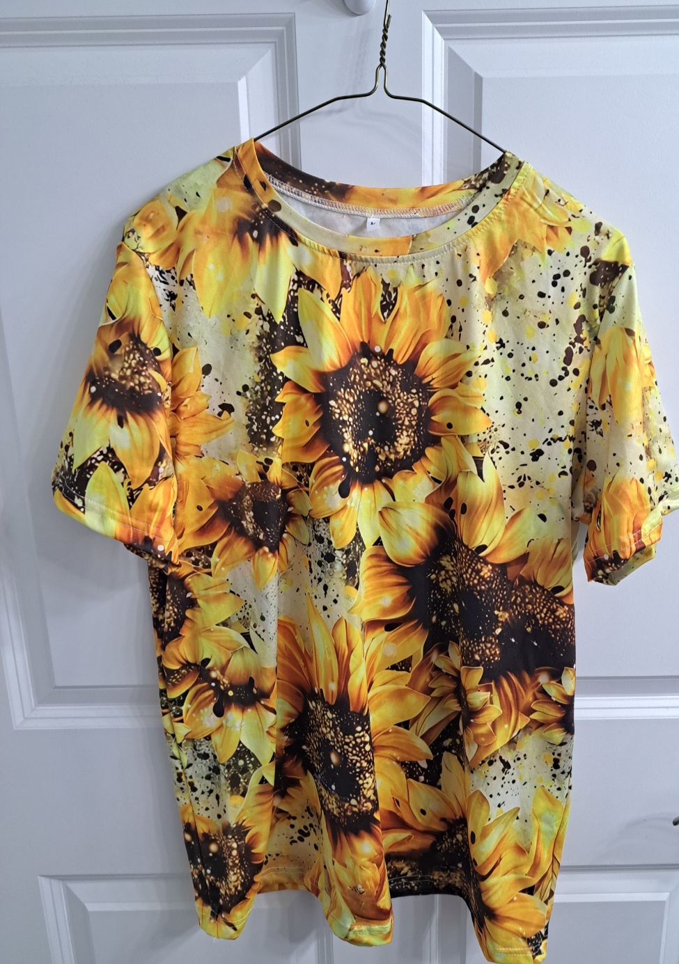 Very pretty Sunflower top. I somehow ordered too many of these kind of Sunflower shirts, and I don't need my whole wardrobe done in Sunflowers! It looks the same on the front and the back. Size Large, machine wash, 95% polyester, 5% Elastic. The measurements of the top are in the photos. Comes from my nonsmoking home. Always FREE SHIPPING
