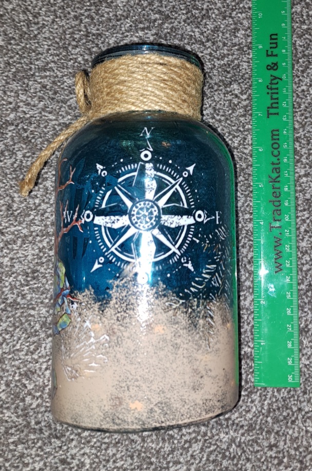 Very pretty Coastal decor jar. Could be used to store kitchen utensils, or cotton balls in the bathroom, or put some fairy lights in it and set it on a shelf. This would make a nice gift too. Measurements are in the photos. Comes from my nonsmoking home. Always FREE SHIPPING