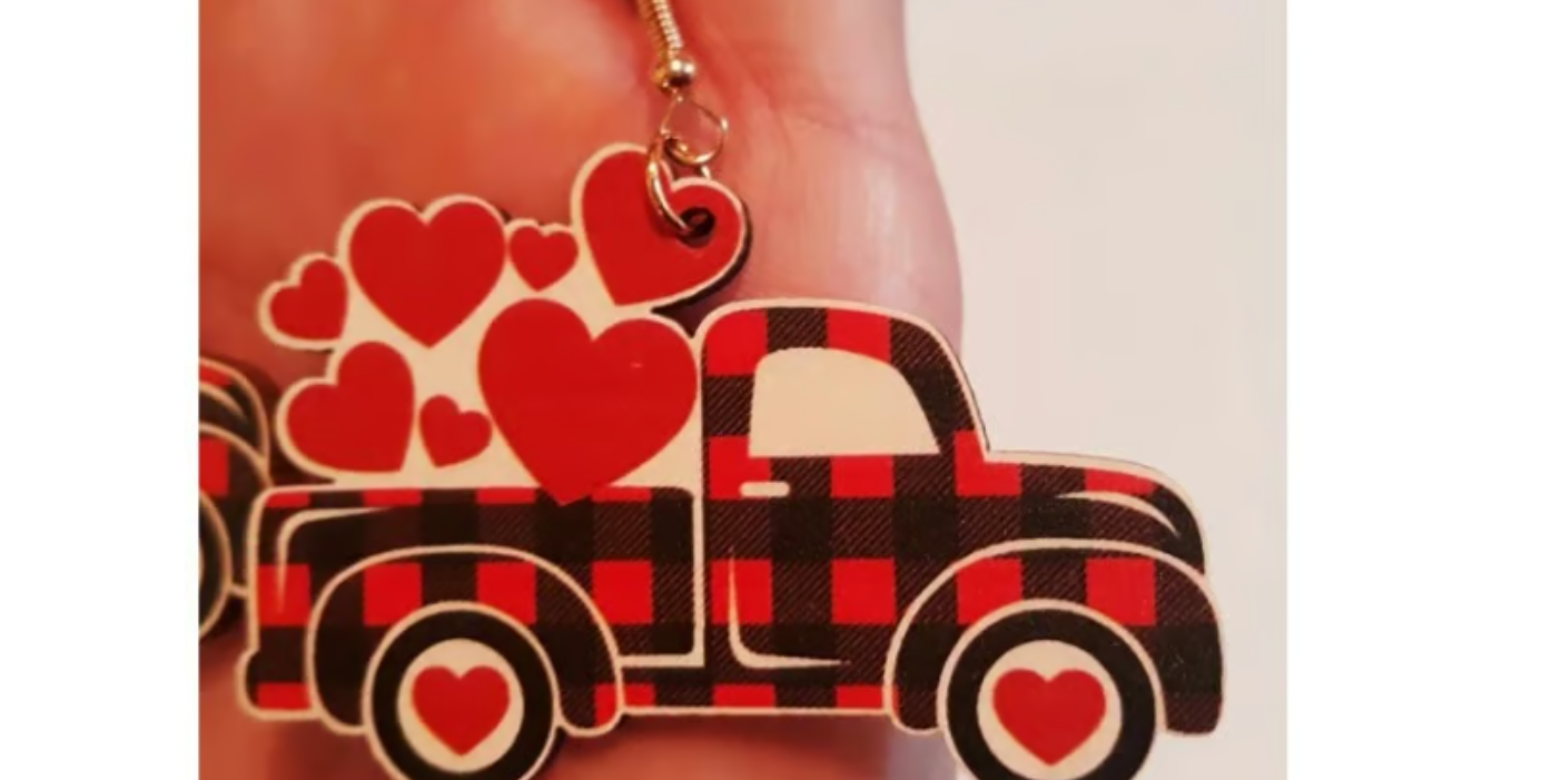 ~Red truck with hearts in the back, pierced earrings