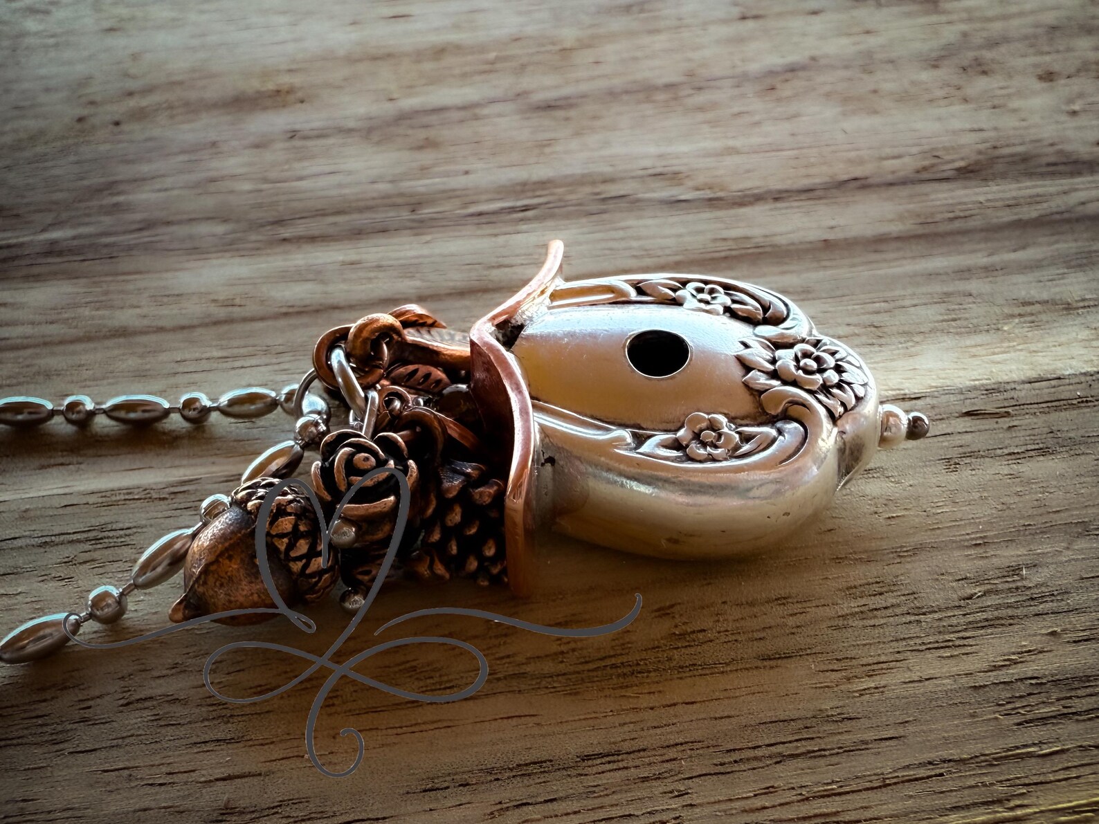 This silverware acorn comes with a 30" stainless steel bamboo/ball chain. I keep the chain long because you can easily shorten it by merely clipping off as many ball beads as needed.