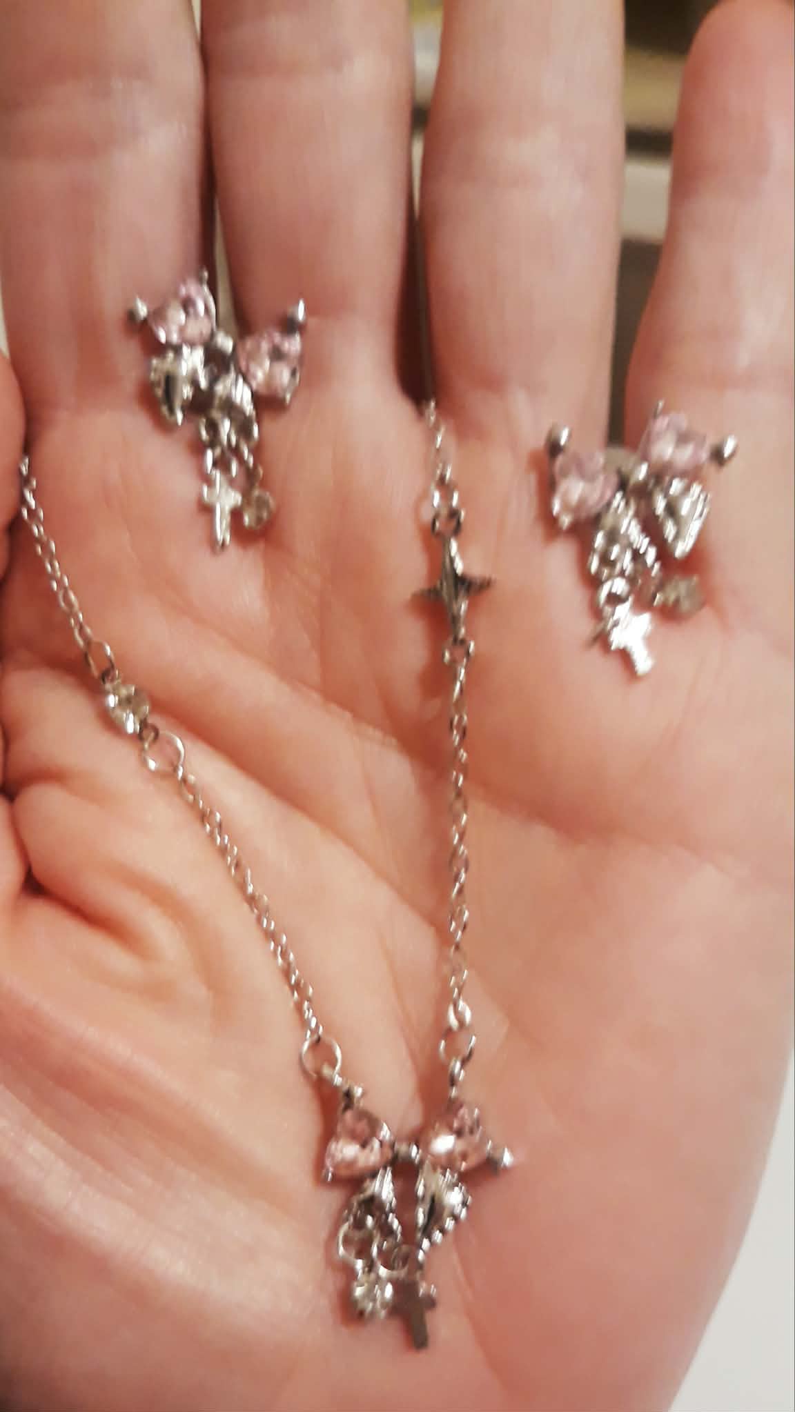 ~Pendant has a bow with pink CZs and small cross, pierced earrings, ring is a size 7 but is adjustable
