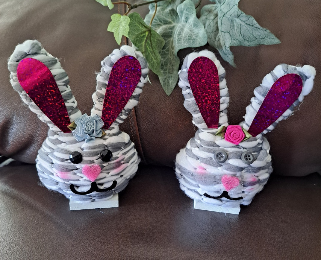 Very cute Bunnies for Spring/Easter. Made with yarn, on a bunny head form. Little fabric roses on each head. Would make nice decor, or a gift in an Easter basket. Measurements are in the photos. Comes from my nonsmoking home. Always FREE SHIPPING