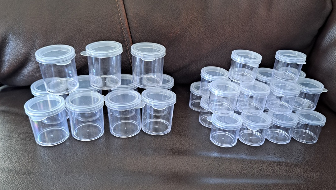 These little containers are perfect for small items, crafts, pills, even to put make-up in! There are 11, Larger containers that measure 1 1/5" x 1 1/4"; and 22 Smaller containers that measure 1"x1". Each of these 33 containers come with a snap top lid. Comes from my nonsmoking and pet free home. Always FREE SHIPPING