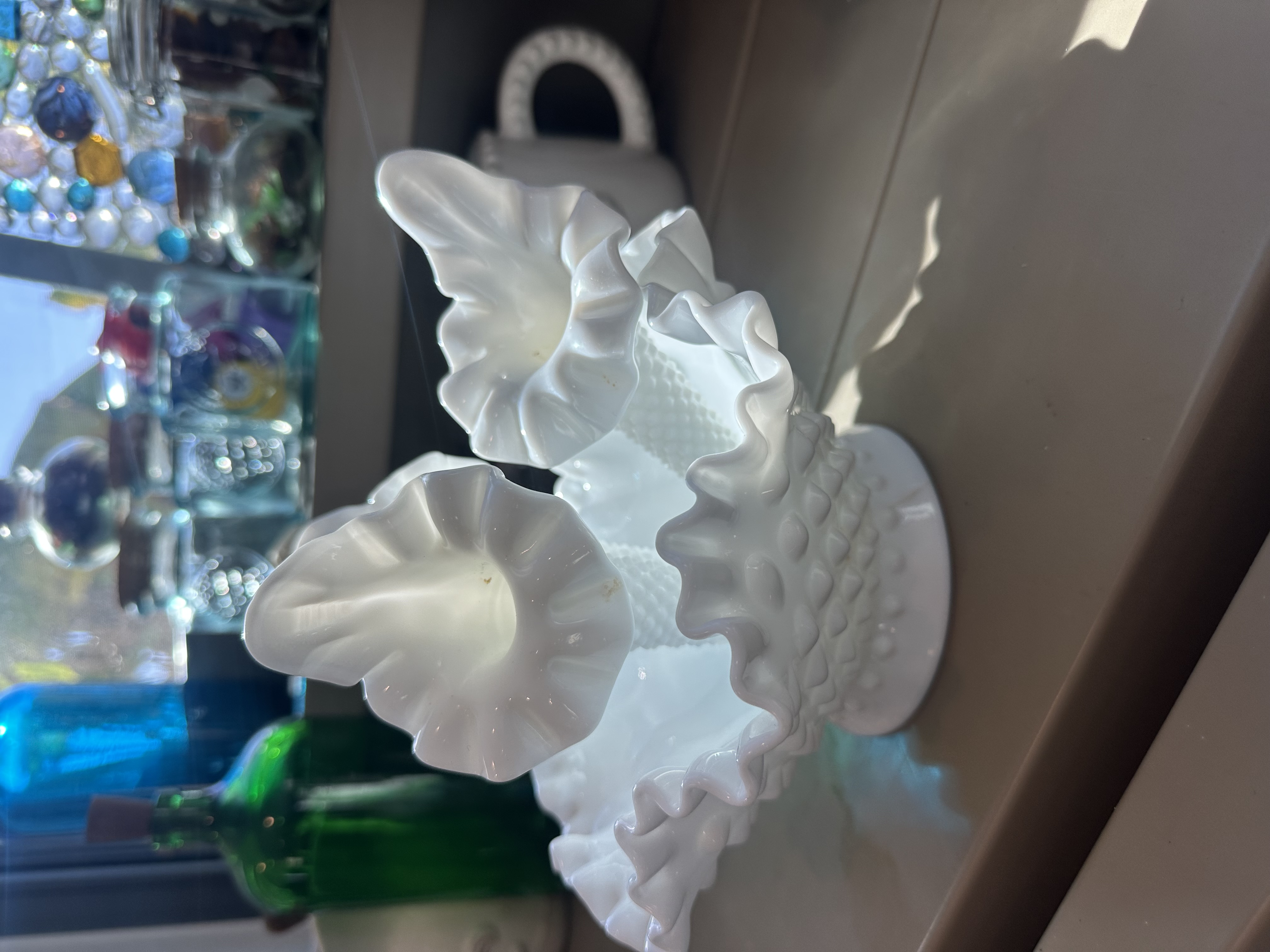 This is a very old vintage milk glass by Fenton. It is called Hobnail Epergne Centerpiece- sales for over $100 - some call it Horn centerpiece
