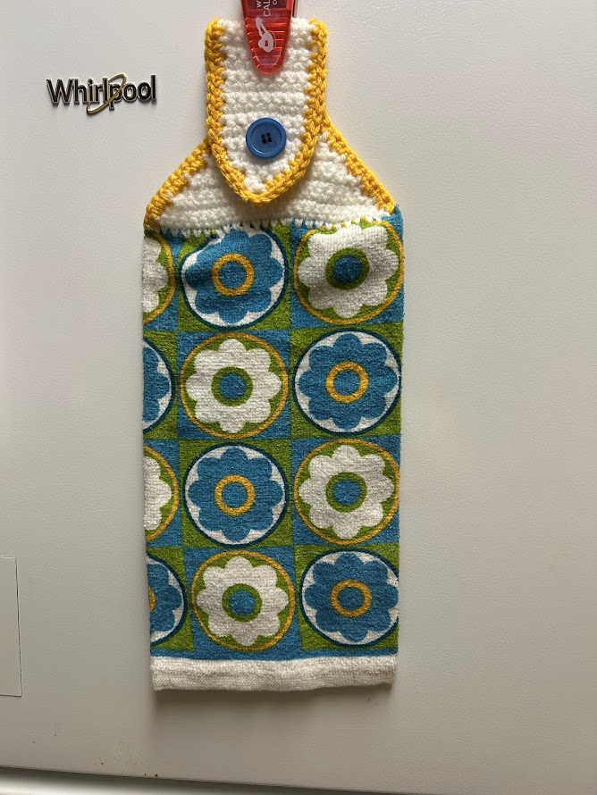 This abstract blue and gold blend floral towel is prefect for your kitchen.. topped in white yarn and edged in gold yarn with a round plastic button.