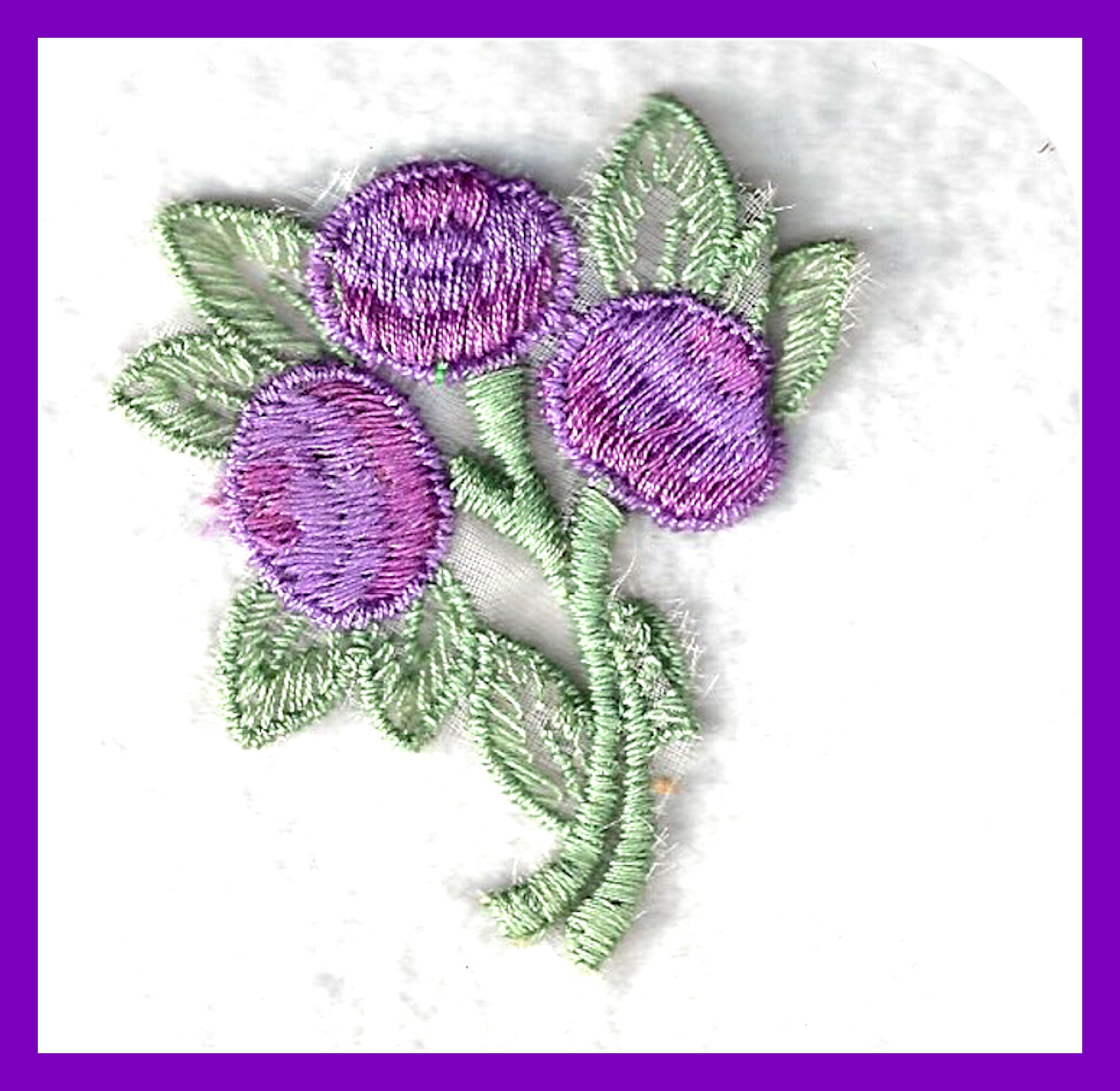A set of 10 beautiful 2-1/4 x 2-1/2 inch embroidered purple and green flower bud appliques as shown. Each a triple bud/flower to be! Sew or glue on only. One set in a first class envelope. Enlarge for details and ask any questions. . ONE set is 10 flowers.