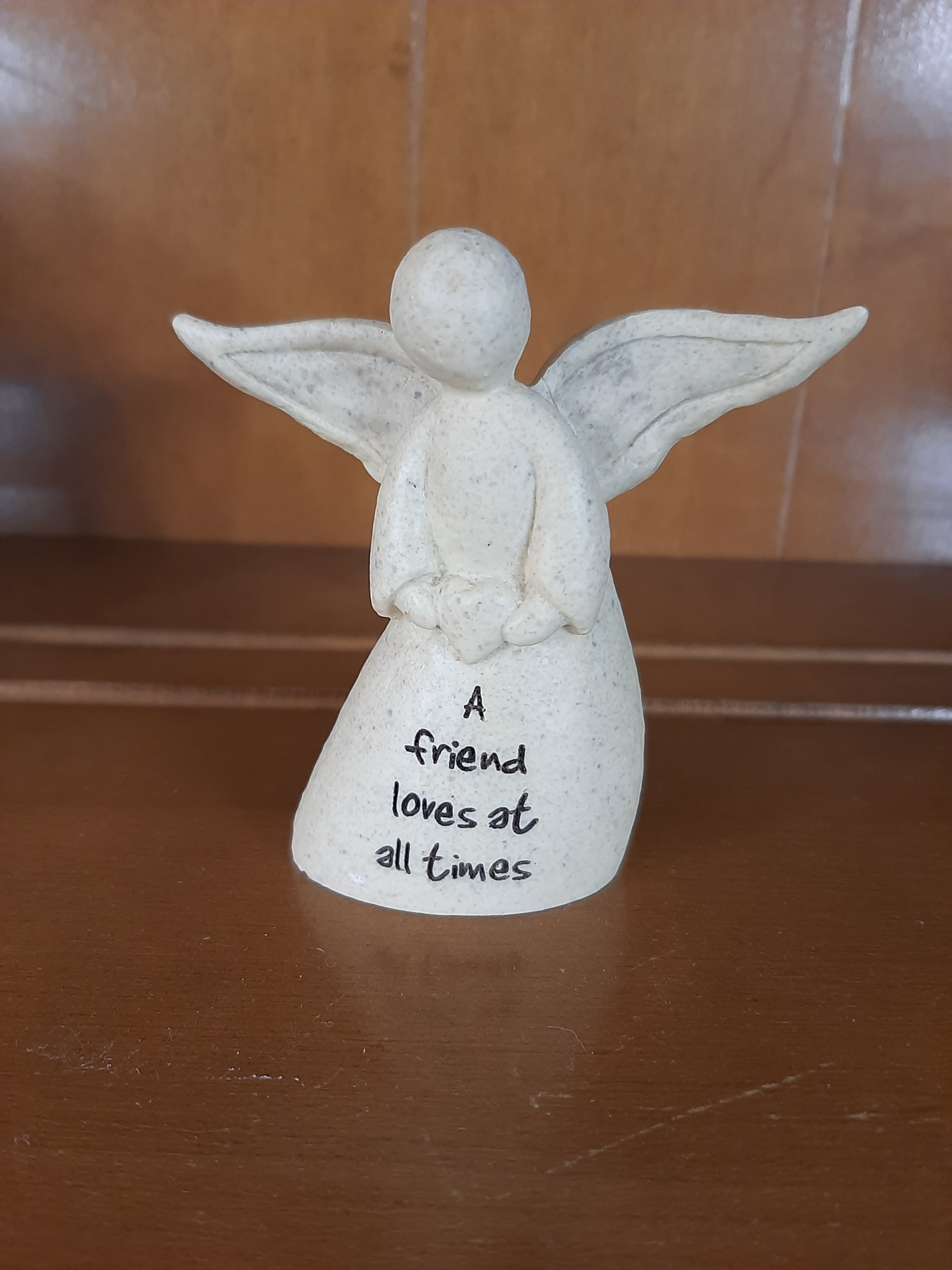 Beautiful friendship angel by the Roman Company. It is 3 1/4" high. It says "A friend loves at all times". It is a resin and stone mix. New without tags or box. It is a beige color with a textured surface.